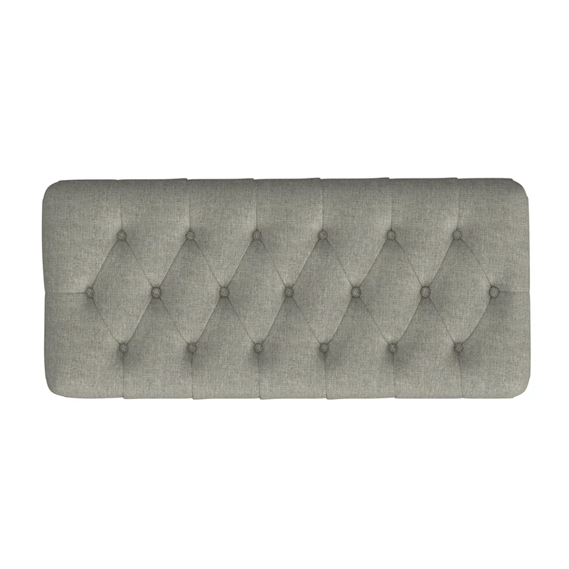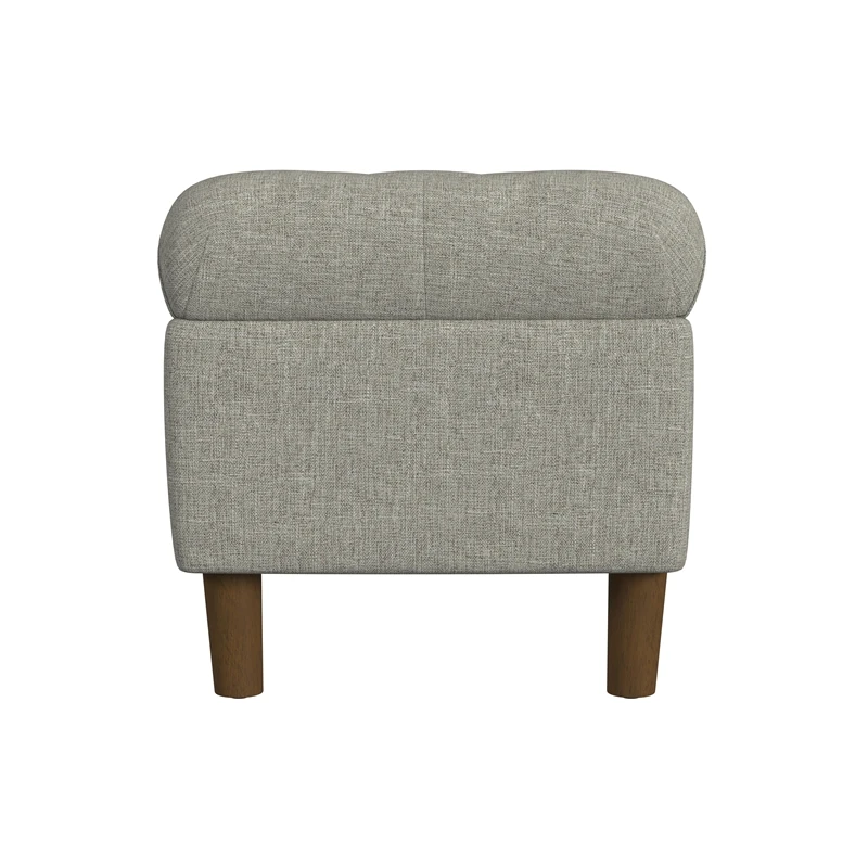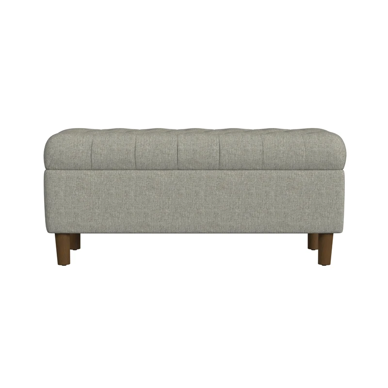 Plush yet practical, this tufted storage bench provides a variety of home decor options. Use it as a coffee table ottoman in a living room to serve guests. Position it in a family room to relax feet on after a long day. Place it as an end of bed bench to hold pillows and blankets. With wood round shaped legs in a mid tone walnut finish, soft textured fabric in a neutral gray, and a hinged lid for easy access, this large tufted storage bench is a premium addition for any home. Easy to assemble and maintain.