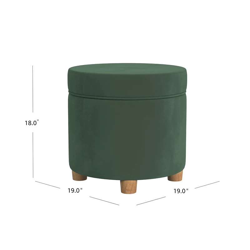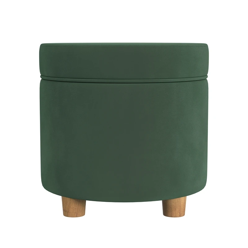 This modern round ottoman features a lift-off lid for convenient storage. Upholstered in velvet fabric with welting on the lid, this modern ottoman has wood legs in a complementary finish. Use this multifunctional storage ottoman to hide accessories in a bedroom, to store books or magazines in a living room, or to keep controllers or remotes nearby but out of sight in a family room. Pair two together for added impact. This ottoman is available in a variety of colors and is easy to assemble and maintain.