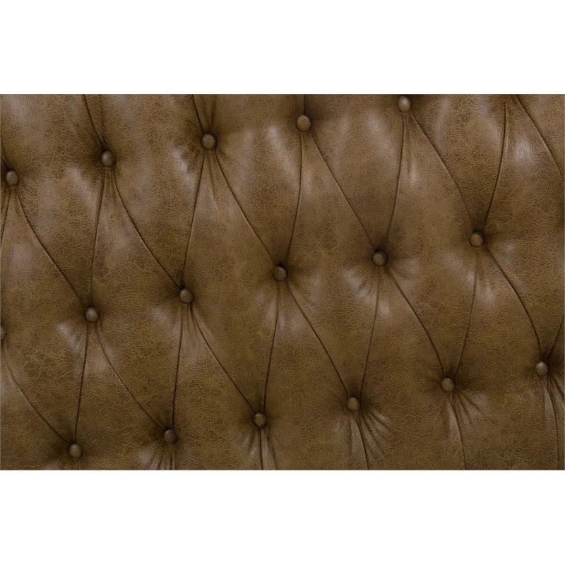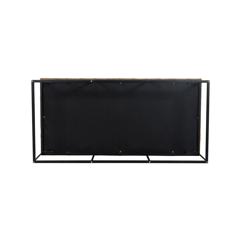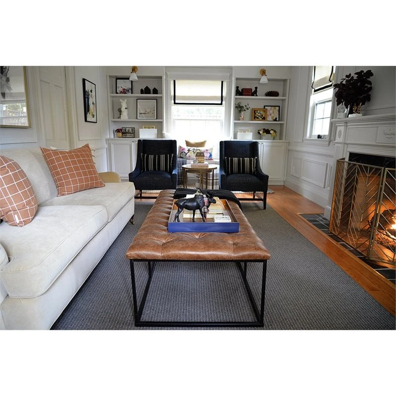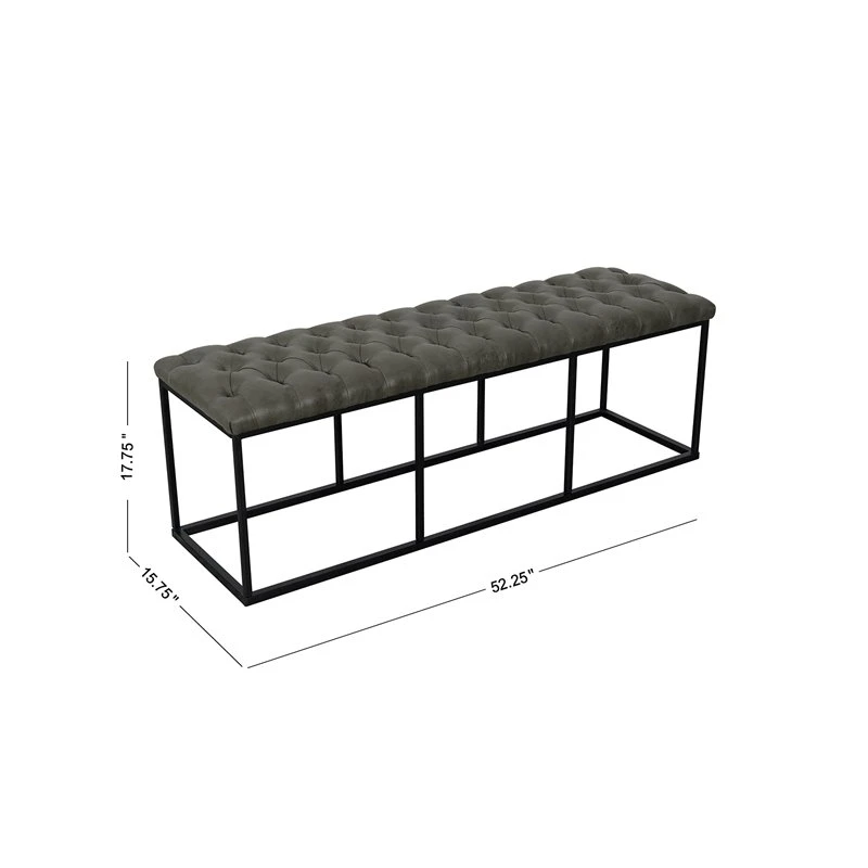 The Draper Large Ottoman exudes masculine style and can perform multiple functions in any home. Use it as a coffee table ottoman in the living room, as an end of bed bench in the bedroom, or as extra seating in the dining room or family room. This 58″ ottoman features an open metal frame that offers substantial size without overwhelming the space. The light brown faux leather button tufted top adds texture that contrasts well with the sleek black metal styling of the base. Easy to maintain with spot cleaning as needed.