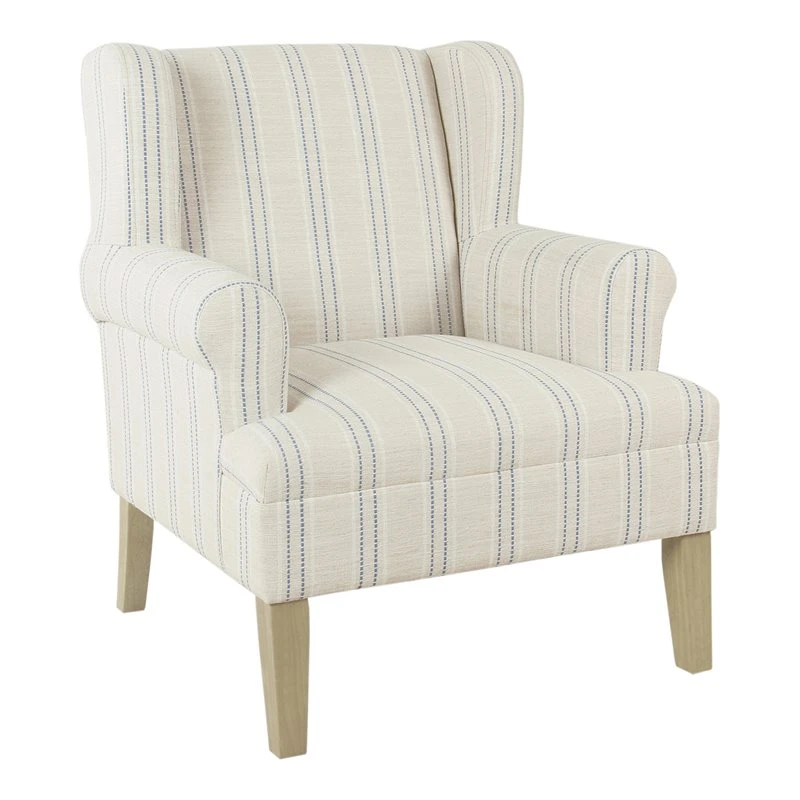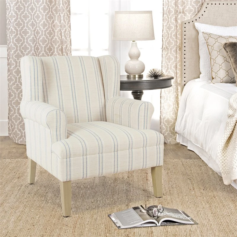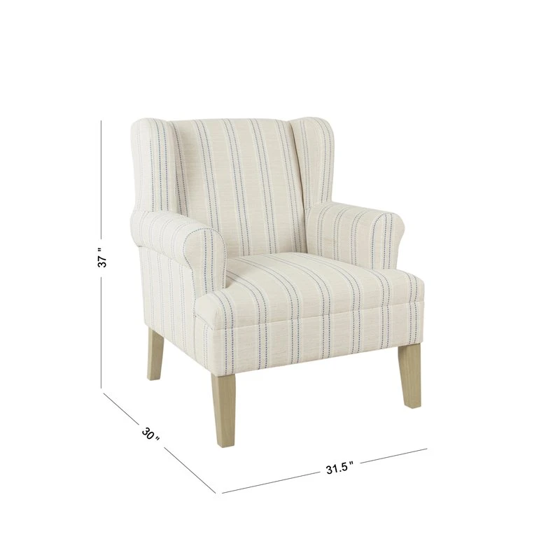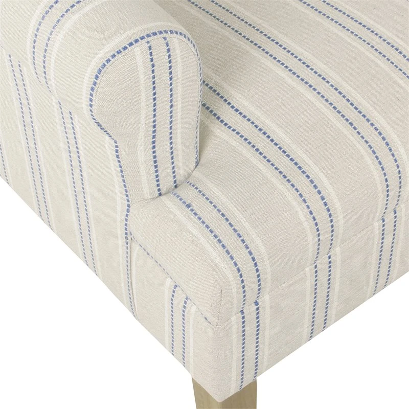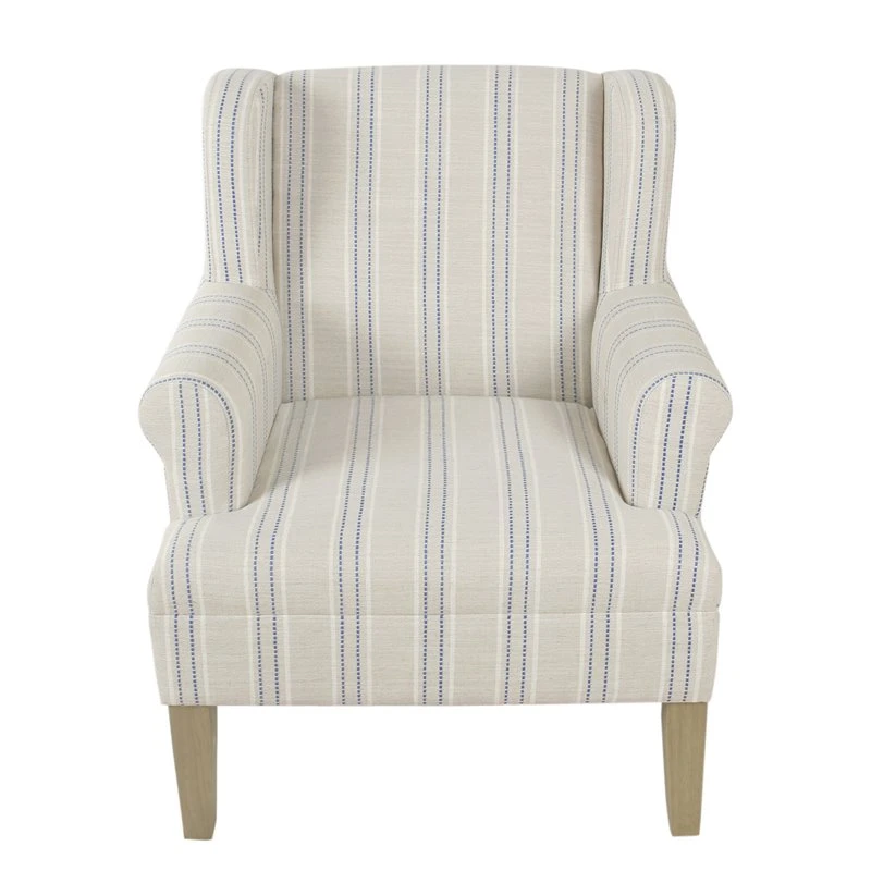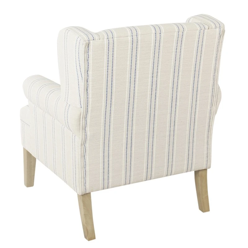 Our rolled arm Emerson chair offers comfort and style in a classic blue and white stripe with natural wood finish. Our Emerson Rolled Arm Accent Chair has a timeless appeal that complements a broad range of home decor. Use one accent chair in your living room or bedroom or pair two together for a fashionable seating solution. Easy to assemble and maintain.