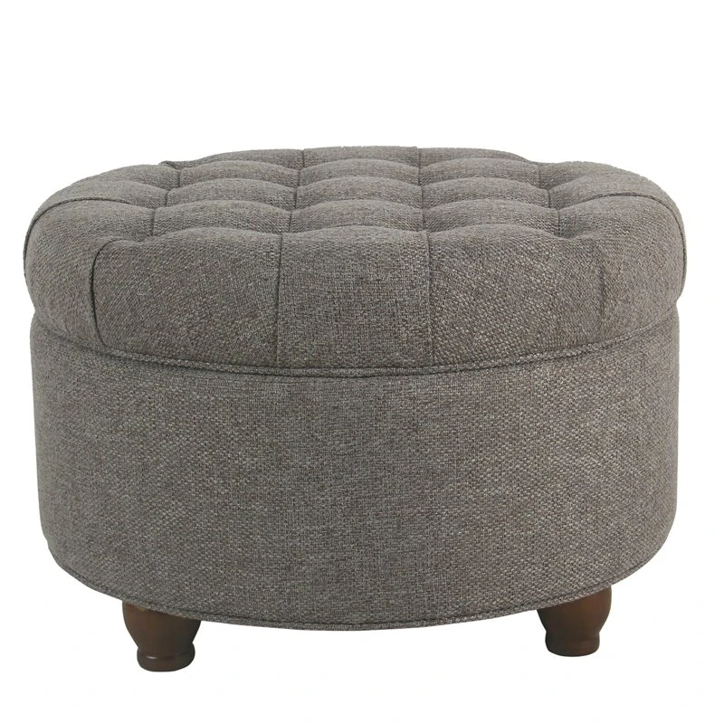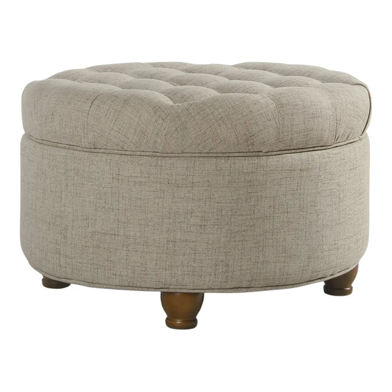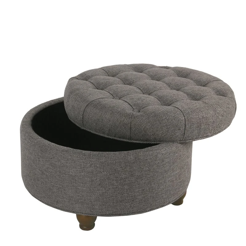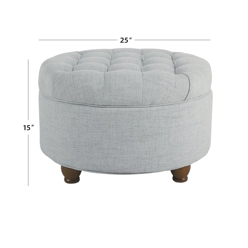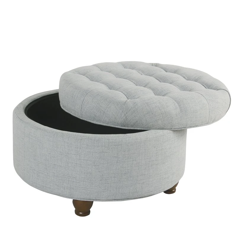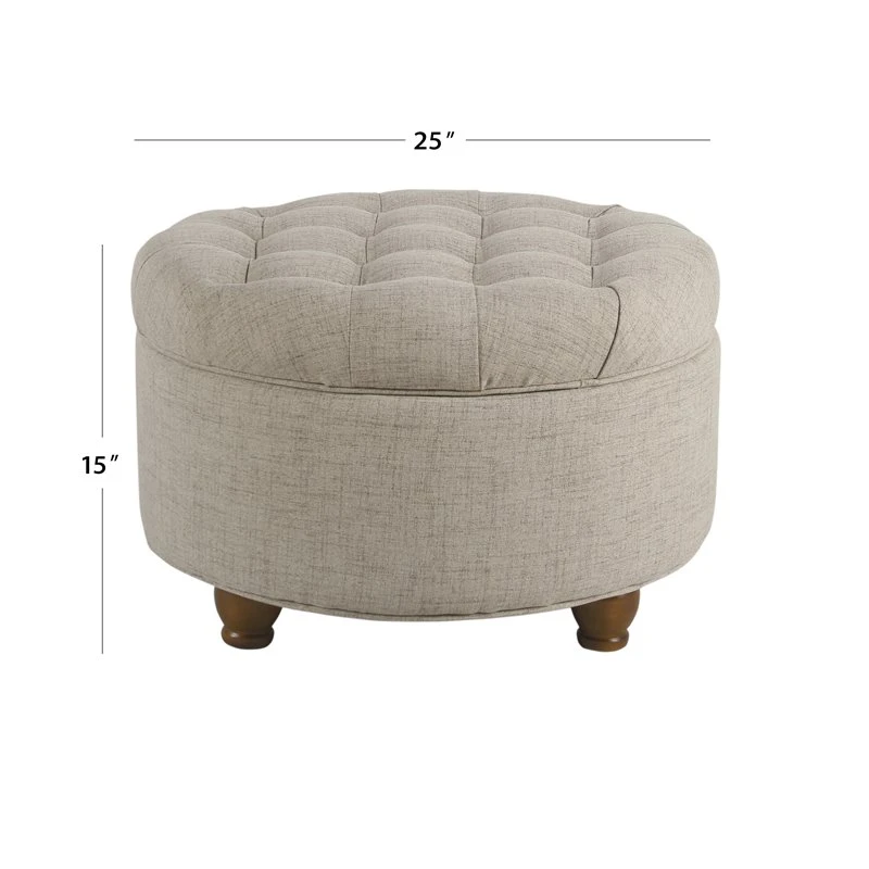 This large round ottoman offers timeless style combined with practical storage in Use it in a living room or family room to contain controllers, remotes or toys or place it in the bedroom to store extra pillows or blankets when not in use. Use it as an ottoman coffee table or pair two together to double the impact wherever it’s needed most. This round ottoman has a tufted lift-off lid for quick access to storage and tapered wood legs. Available in a range of neutral colors and fabrics; this storage ottoman is easy to assemble and maintain.