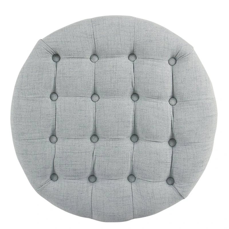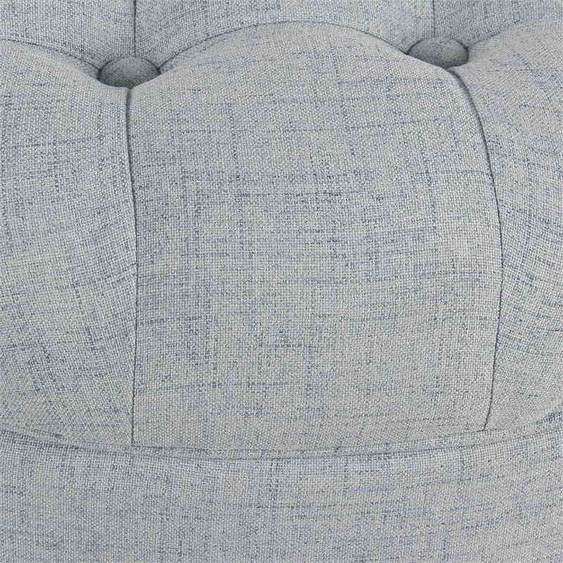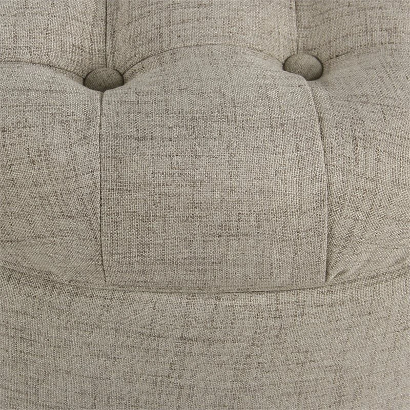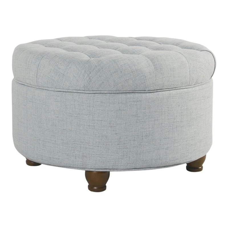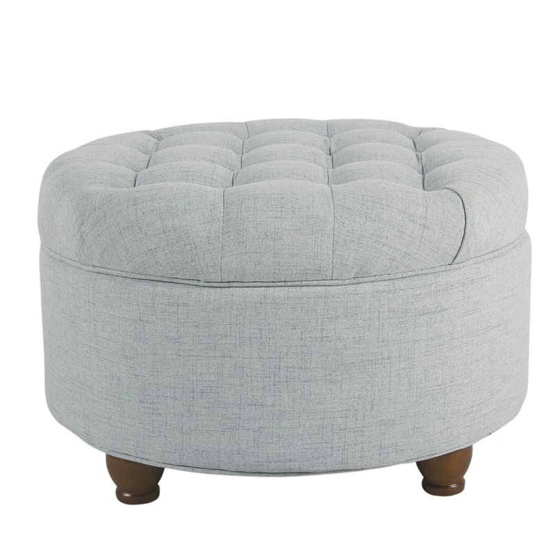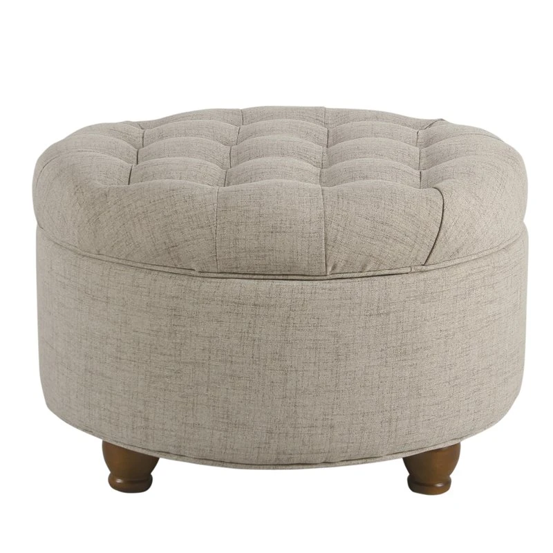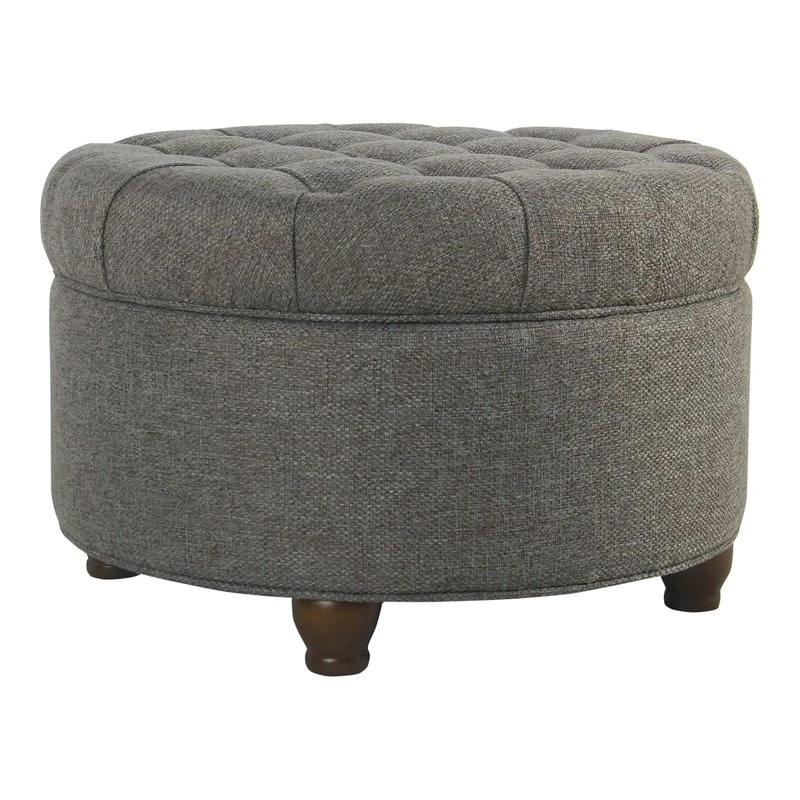 This large round ottoman offers timeless style combined with practical storage in Use it in a living room or family room to contain controllers, remotes or toys or place it in the bedroom to store extra pillows or blankets when not in use. Use it as an ottoman coffee table or pair two together to double the impact wherever it’s needed most. This round ottoman has a tufted lift-off lid for quick access to storage and tapered wood legs. Available in a range of neutral colors and fabrics; this storage ottoman is easy to assemble and maintain.