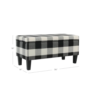Bring a combination of classic style and versatile storage to your space with this Plaid Decorative Storage Bench from HomePop. Featuring an iconic black and white plaid exterior for timeless style, this upholstered storage bench brings a welcoming accent to your space whether you use it in your living room or your entryway. The rectangle frame offers plenty of space for sitting and relaxing, while the hinged top makes it easy to store shoes, pillows, board games and more. Painted hardwood legs complete the look while providing stability, making this bench a functional and stylish addition to your home.