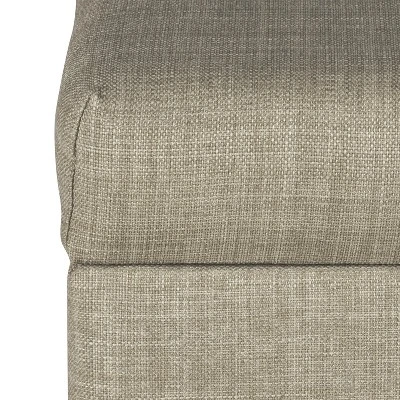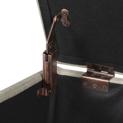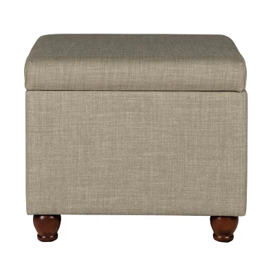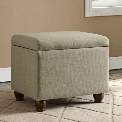This tan ottoman offers simple and timeless design in a neutral linen-like fabric with wood legs in a rustic brown finish. Store extra pillows or blankets in a bedroom, hide remotes or game controllers in the family room, or conceal shoes, gloves or scarves in the entryway. When needed, the ottoman with storage can double as a coffee table in a living room or provide extra seating in a dining room. With a convenient hinged lid and easy to access spacious storage, this ottoman will be a great addition to any home! Easy to assemble and maintain.